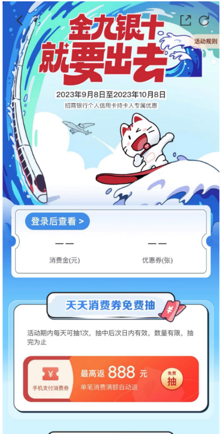 旅行正在成為當(dāng)下最熱的消費(fèi)增長點(diǎn)之一。針對這一重要場景,招行信用卡與頭部OTA平臺攜程聯(lián)手推出了消費(fèi)返現(xiàn)活動。活動期間,每個用戶都可以領(lǐng)取一張攜程旅行App的“消費(fèi)滿1000元返10-888元券”和“分期消費(fèi)滿2000元返88-888元券”,數(shù)量有限,先到先得。