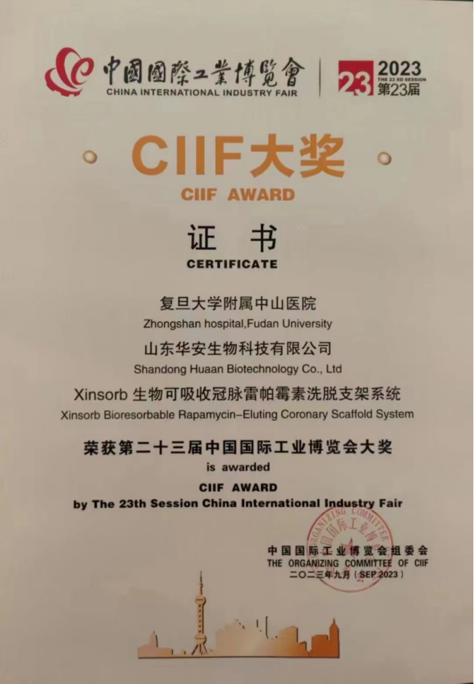 2023年9月19日-23日,第二十三屆中國(guó)國(guó)際工業(yè)博覽會(huì)在上海召開(kāi)。815項(xiàng)高科技項(xiàng)目亮相,諸多國(guó)際一流的技術(shù)產(chǎn)品首次在工博會(huì)登臺(tái)。本屆工博會(huì)十項(xiàng)工博會(huì)大獎(jiǎng)CIIF在開(kāi)幕式揭曉,復(fù)旦大學(xué)附屬中山醫(yī)院、山東華安生物科技有限公司的“Xinsorb生物可降解支架”系統(tǒng),一舉斬獲本屆工博會(huì)CIIF大獎(jiǎng)。