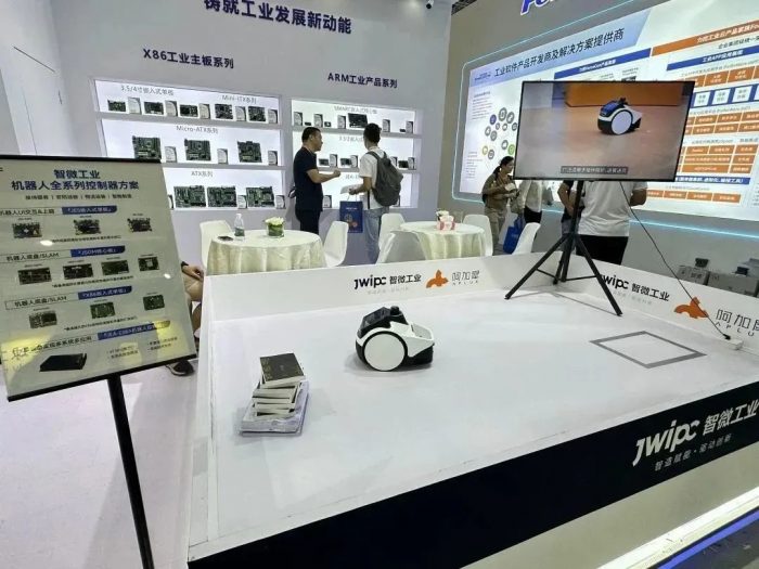 在智能機(jī)器人解決方案展區(qū),智微工業(yè)聯(lián)合阿加犀機(jī)器人,展出了一芯多用解決方案設(shè)計(jì)的服務(wù)機(jī)器人,憑借著小巧可愛和高靈活度成為了現(xiàn)場焦點(diǎn)?;贘EA-E88A機(jī)器人控制器的阿加犀移動服務(wù)機(jī)器人,具備高強(qiáng)度運(yùn)作、實(shí)時(shí)性控制和連續(xù)穩(wěn)定工作等特點(diǎn),智微工業(yè)通過現(xiàn)場講解,為與會嘉賓展現(xiàn)了智微工業(yè)在機(jī)器人領(lǐng)域的最新應(yīng)用實(shí)現(xiàn)成果。