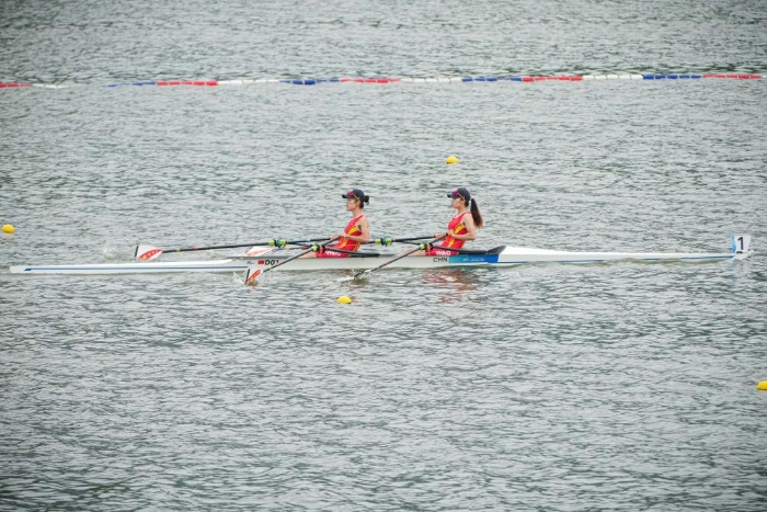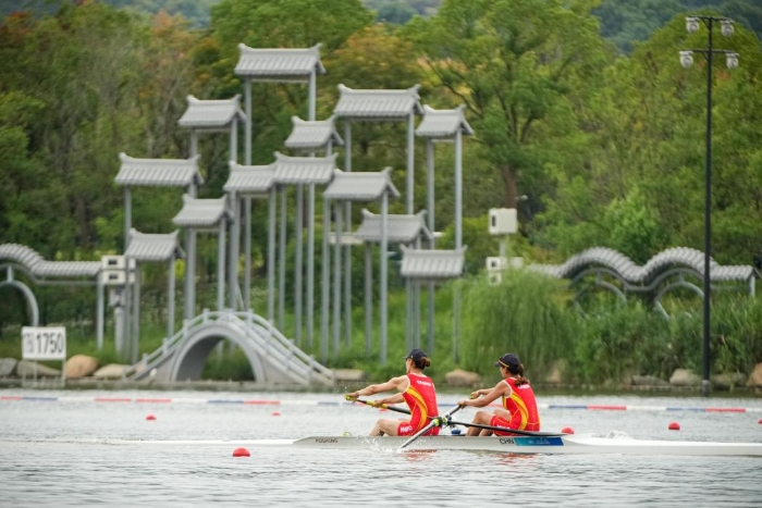 9月20日,中國組合王婷婷/張旋在賽艇女子雙人單槳預(yù)賽中。新華社記者 江漢 攝