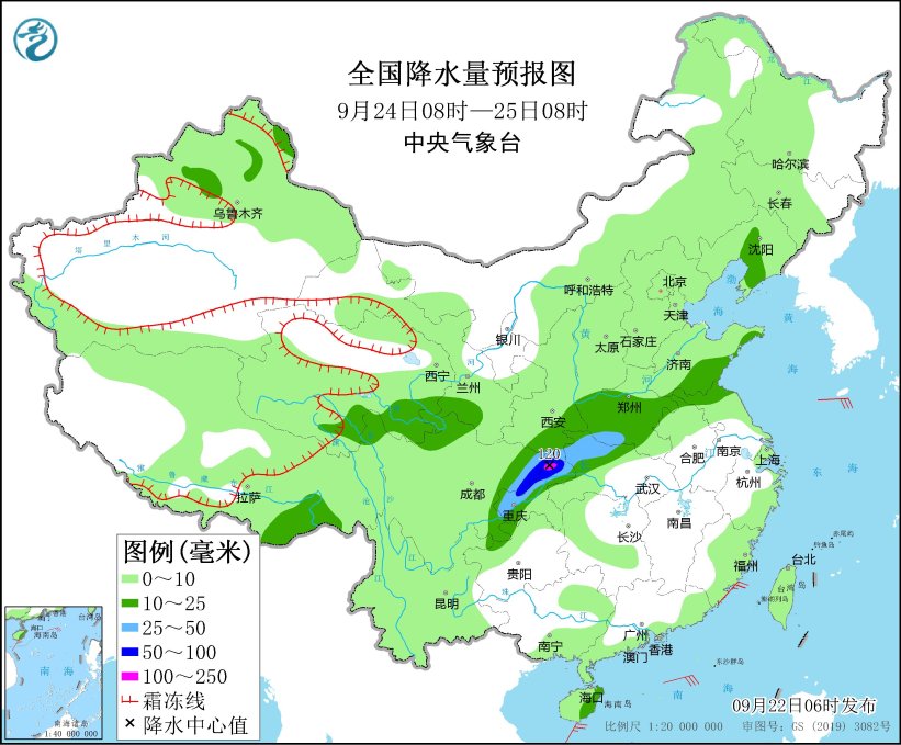 9月24日08時至25日08時,青海南部、甘肅南部、陜西南部、四川東部、重慶、湖北西部和北部、河南、山東南部等地部分地區(qū)有中到大雨,其中,四川東北部、重慶北部等地局地有暴雨或大暴雨(100~120毫米)。
