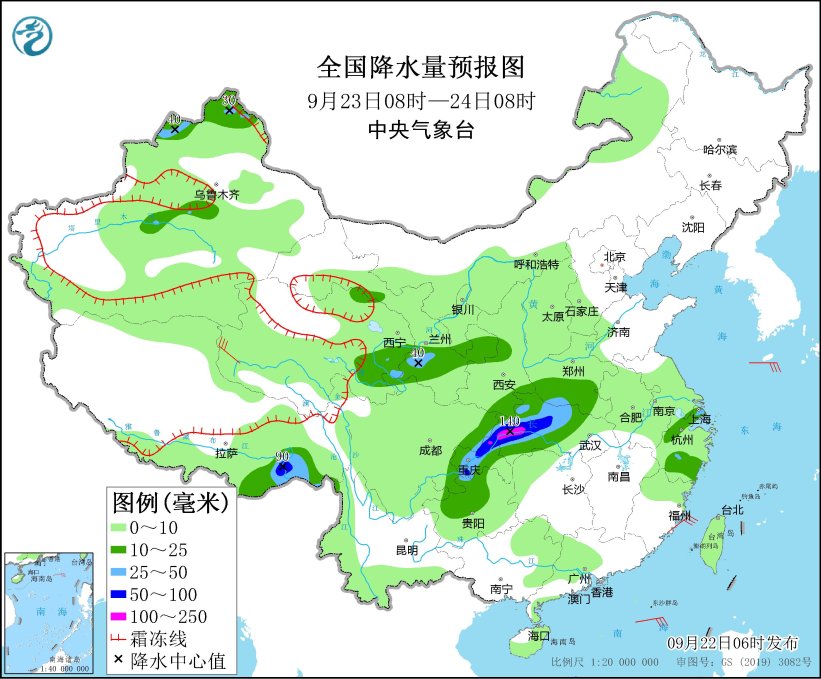 9月23日08時至24日08時,新疆北疆北部、西藏東南部、青海東部、甘肅東部、四川東部、重慶、貴州中北部、湖北中西部、河南南部、浙江西北部和南部等地部分地區(qū)有中到大雨,其中,西藏東南部、湖北西部、重慶中北部等地局地有暴雨或大暴雨(100~140毫米)。青海西部部分地區(qū)有5~6級風。