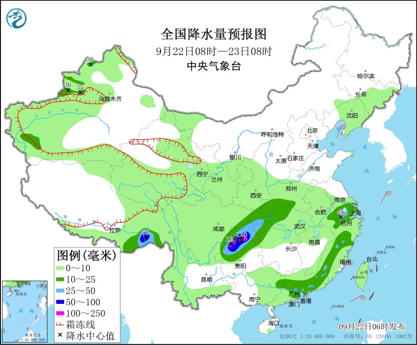 9月22日08時至23日08時,新疆伊犁河谷、西藏東南部、四川盆地東部、重慶、貴州中北部、湖北西部、江蘇南部、上海、浙江、福建、廣東中東部等地部分地區(qū)有中到大雨,其中,西藏東南部、四川東南部、重慶南部、貴州北部等地局地有暴雨或大暴雨(100~120毫米)。