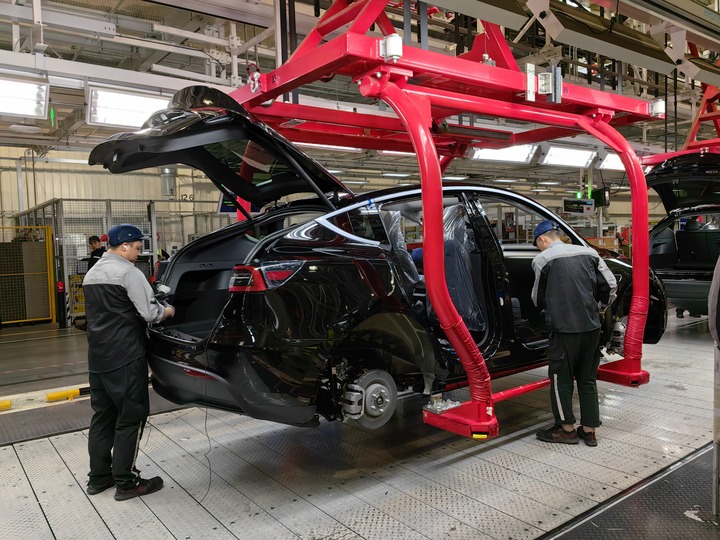 在特斯拉上海超級(jí)工廠,工人在車間內(nèi)忙碌。新華社記者 周蕊 攝