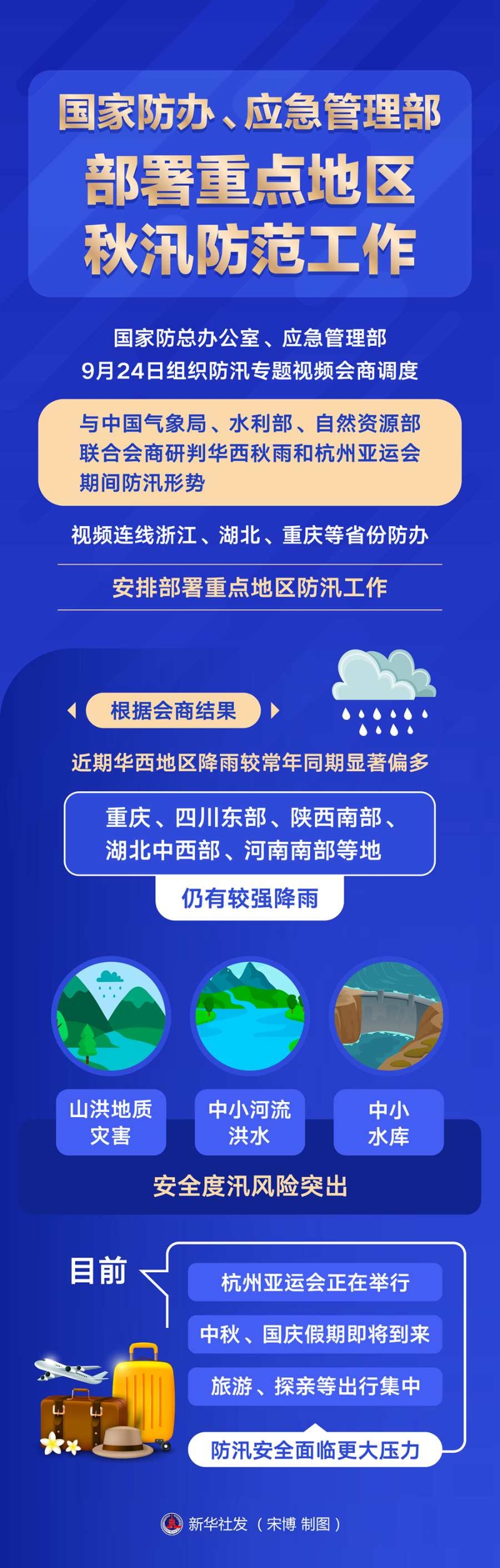 根據(jù)會(huì)商結(jié)果,近期華西地區(qū)降雨較常年同期顯著偏多,重慶、四川東部、陜西南部、湖北中西部、河南南部等地仍有較強(qiáng)降雨,山洪地質(zhì)災(zāi)害、中小河流洪水、中小水庫(kù)安全度汛風(fēng)險(xiǎn)突出。目前,杭州亞運(yùn)會(huì)正在舉行,中秋、國(guó)慶假期即將到來(lái),旅游、探親等出行集中,防汛安全面臨更大壓力。