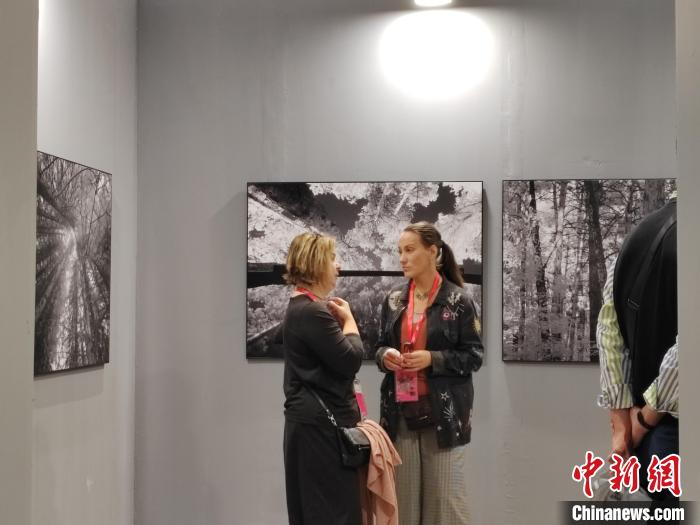9月21日,俄羅斯策展人契梅瑞娃(右)與攝影師聊天。中新社記者 高雨晴 攝