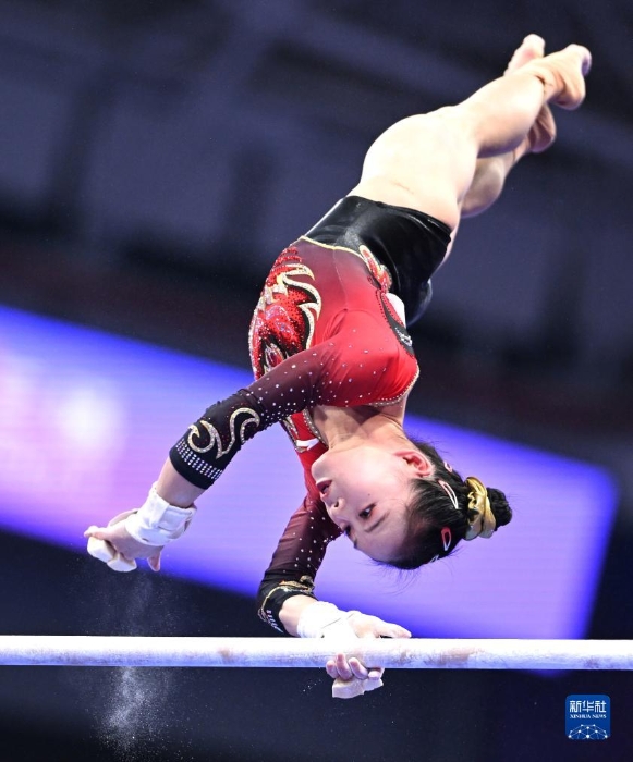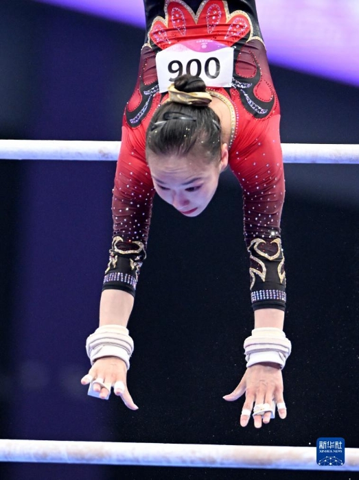 9月25日,中國隊選手章瑾在高低杠項目中。