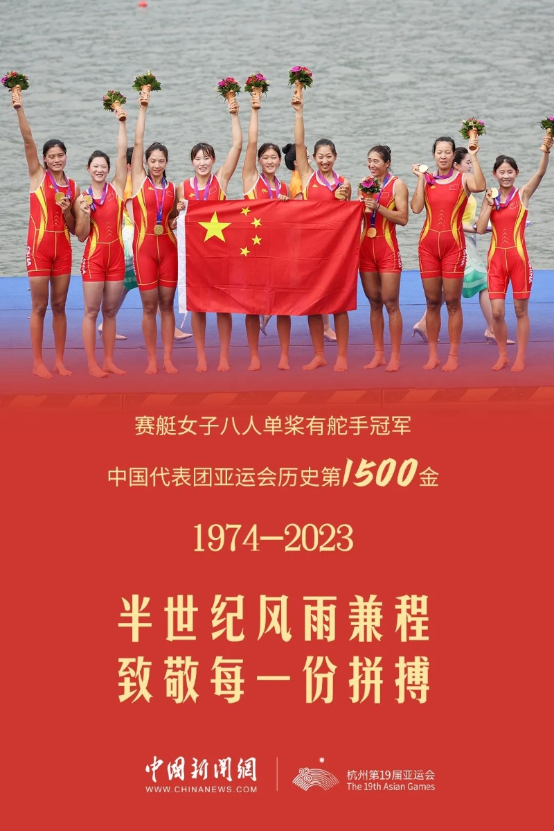 此后進行的賽艇女子八人單槳有舵手決賽中,由張書賢、俞思源、鮑麗郡、董郗婭、張海蓉、劉曉鑫、王子鳳、徐星葉和徐霄韓組成的中國隊以6分33秒61的成績收獲金牌。這是中國體育代表團亞運會歷史第1500枚金牌。