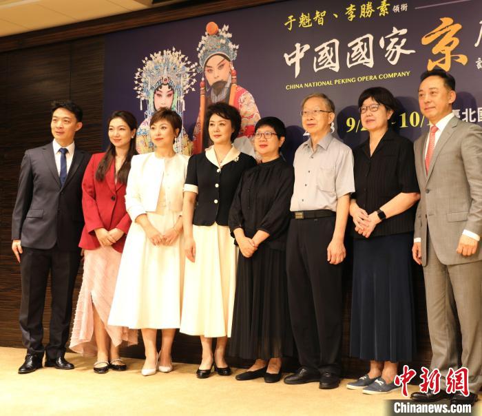 9月25日,京劇名家于魁智(右一)、李勝素(左四)出席在臺北舉行的國家京劇院抵臺記者會。圖為國家京劇院副院長魏麗云(右四)、臺灣大學(xué)戲劇系名譽教授王安祈(右二)、邀請方傳大藝術(shù)總經(jīng)理周敦仁(右三)與青年演員在記者會上合影。中新社記者 劉舒凌 攝