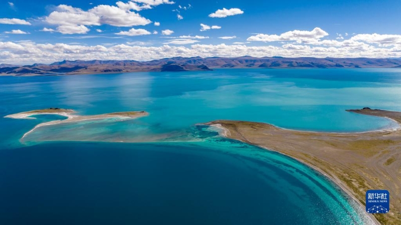 位于改則縣物瑪鄉(xiāng)的物瑪錯因水位下降被沙洲一分為二,湖面呈現(xiàn)不同顏色(無人機照片,9月24日攝)。