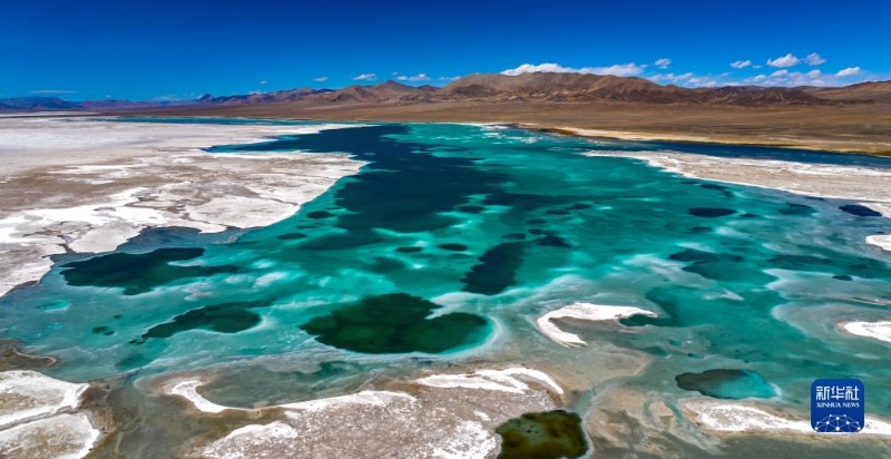 這是位于革吉縣鹽湖鄉(xiāng)的魯瑪仁布錯,湖畔白色地表為天然鹽礦(無人機照片,9月24日攝)。