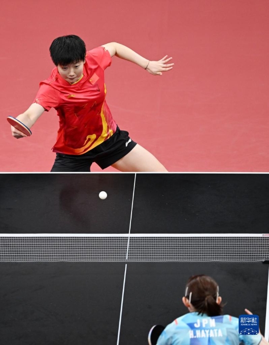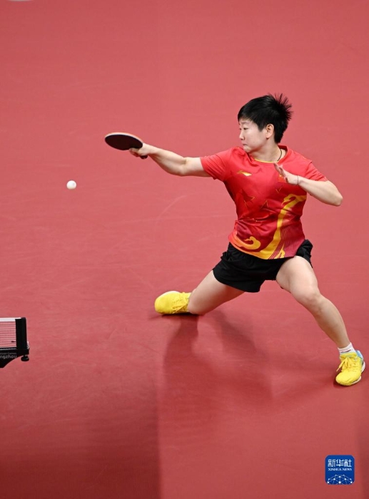 9月26日,中國(guó)隊(duì)選手孫穎莎在比賽中回球。她以3比1戰(zhàn)勝日本隊(duì)選手早田希娜。