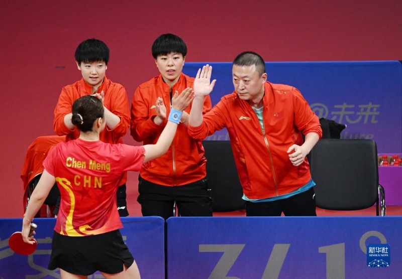 9月26日,中國(guó)隊(duì)教練馬琳(上右)在比賽中與隊(duì)員陳夢(mèng)(下)擊掌慶祝。