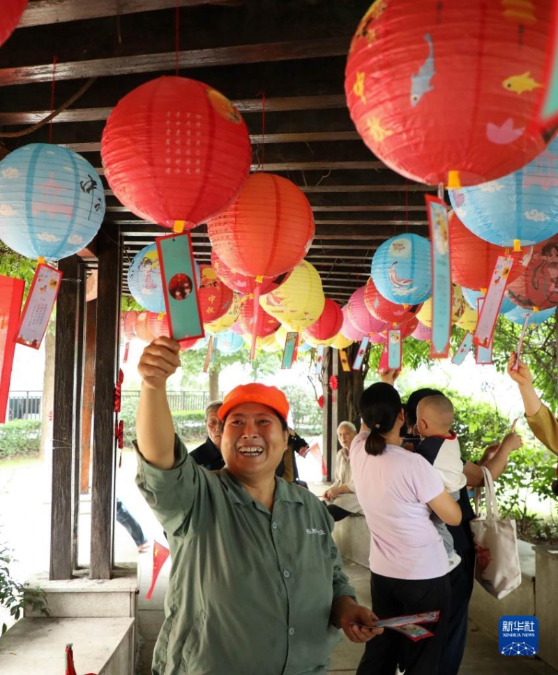 9月26日,人們?cè)诎不帐『戏适蟹饰骺h上派鎮(zhèn)潭沖社區(qū)猜燈謎。