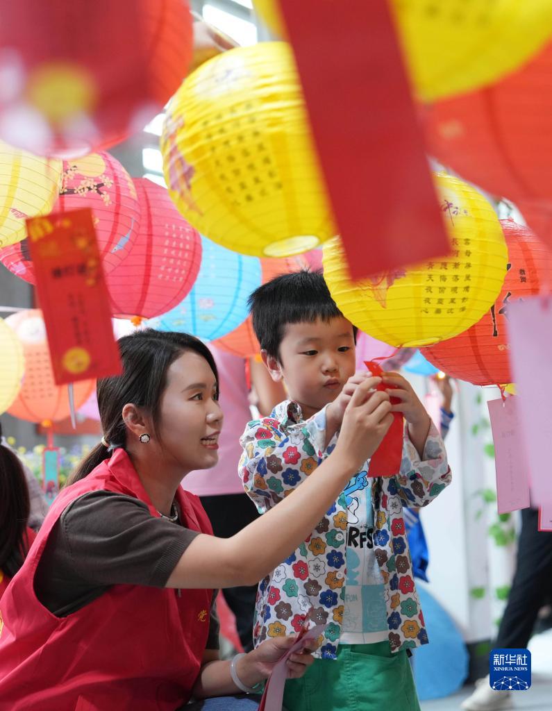 9月26日,在重慶市北碚區(qū)澄江鎮(zhèn)新時(shí)代文明實(shí)踐站,志愿者和小朋友一起猜燈謎。