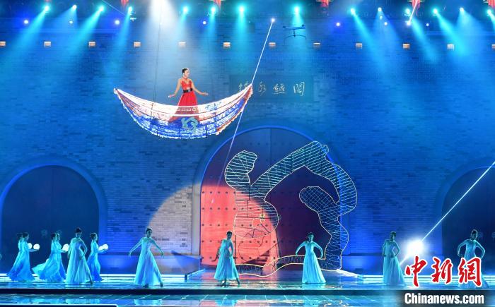 9月25日晚,第十屆絲綢之路國(guó)際電影節(jié)啟動(dòng)儀式福州舉行,圖為開場(chǎng)主題歌舞表演《一路同心》。中新網(wǎng)記者 呂明 攝
