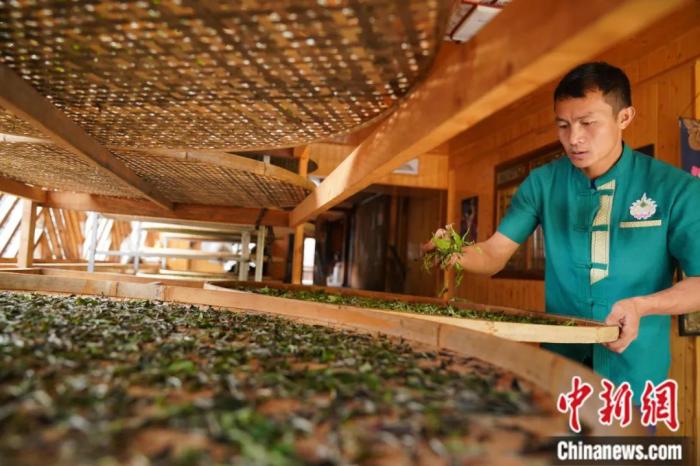 糯干古寨的村民巖查看室內(nèi)晾干的茶葉。劉冉陽 攝