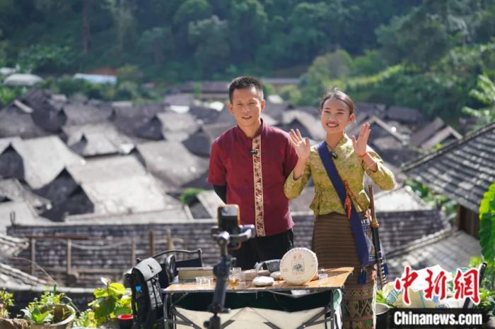 傣族姑娘仙金(右)和男朋友丁志雄(左)在糯干古寨進(jìn)行網(wǎng)絡(luò)直播,向網(wǎng)友推介景邁山和自家出產(chǎn)的茶葉。劉冉陽 攝