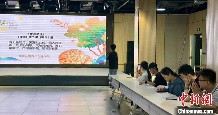 中新網(wǎng)南京9月27日電 (張傳明 周勇)“海上生明月,天涯共此時(shí)。”中華民族傳統(tǒng)的中秋佳節(jié)到來之際,“月滿中秋 情滿江寧”兩岸青年詩歌會(huì)在南京臺(tái)灣青年創(chuàng)業(yè)學(xué)院舉行。30名兩岸青年齊聚,共吟團(tuán)圓詩,共做團(tuán)圓餅,感受中華傳統(tǒng)文化帶來的同根同源情誼。