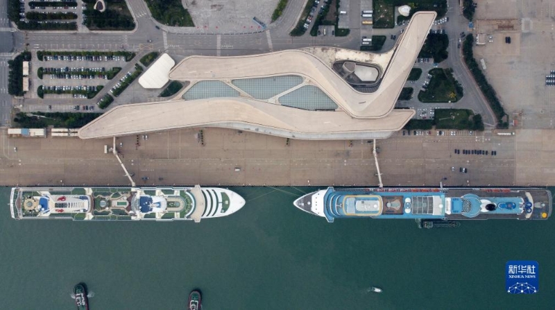 9月27日,天津東方國際郵輪有限公司旗下“夢想”號郵輪(左)、中國船舶集團(tuán)旗下愛達(dá)郵輪“地中?!碧栢]輪靠泊在天津國際郵輪母港準(zhǔn)備啟航(無人機(jī)照片)。