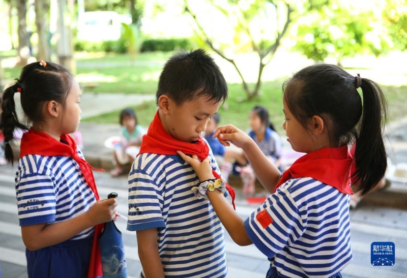 9月27日,海南省三沙市永興學(xué)校的少先隊(duì)員們?cè)凇巴南蜃鎳?guó),我為祖國(guó)獻(xiàn)首歌”活動(dòng)中佩戴紅領(lǐng)巾。