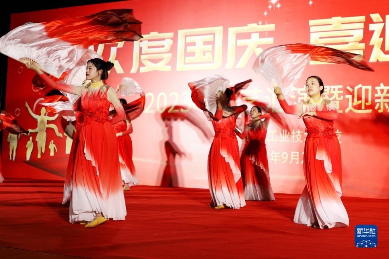 9月26日,學(xué)生在山東省青島市工業(yè)技術(shù)學(xué)校“迎國(guó)慶”主題晚會(huì)上表演舞蹈。