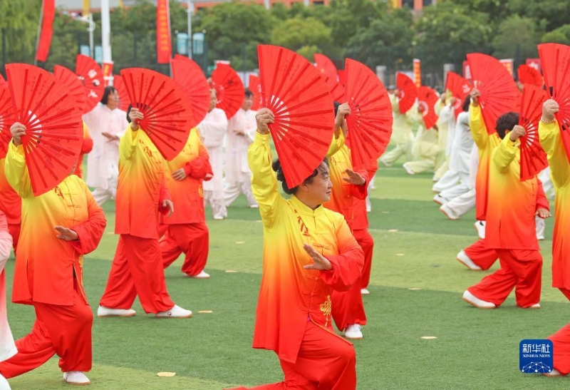 9月27日,人們參加河北省蔚縣“迎國(guó)慶 慶中秋”千人太極集中展演活動(dòng)。