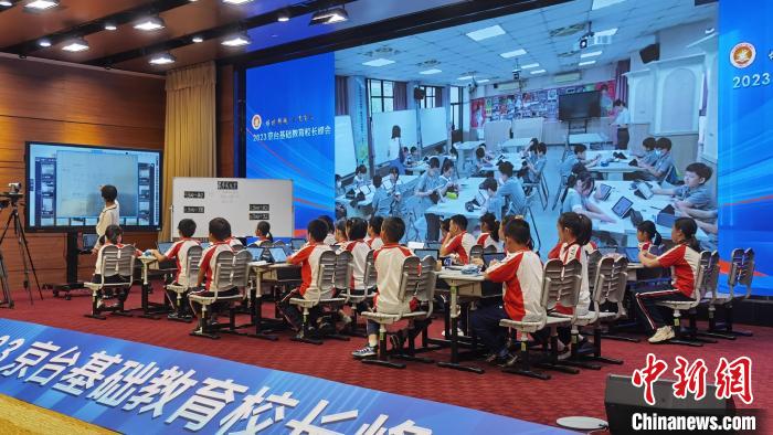 9月27日,2023京臺(tái)基礎(chǔ)教育校長(zhǎng)峰會(huì)主論壇在北京舉辦。圖為新北市北新小學(xué)和東城區(qū)培新小學(xué)師生通過(guò)視頻同上一堂課。中新社記者 劉玥晴 攝