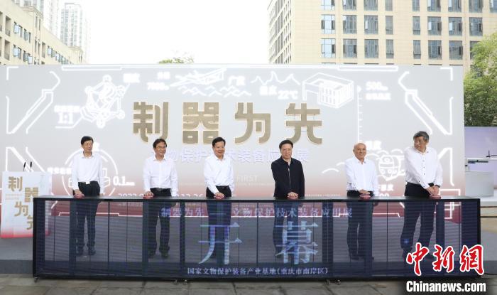 “制器為先——文物保護(hù)技術(shù)裝備應(yīng)用展”9月27日在重慶開幕,圖為嘉賓現(xiàn)場共同為大展揭幕。國家文物局供圖