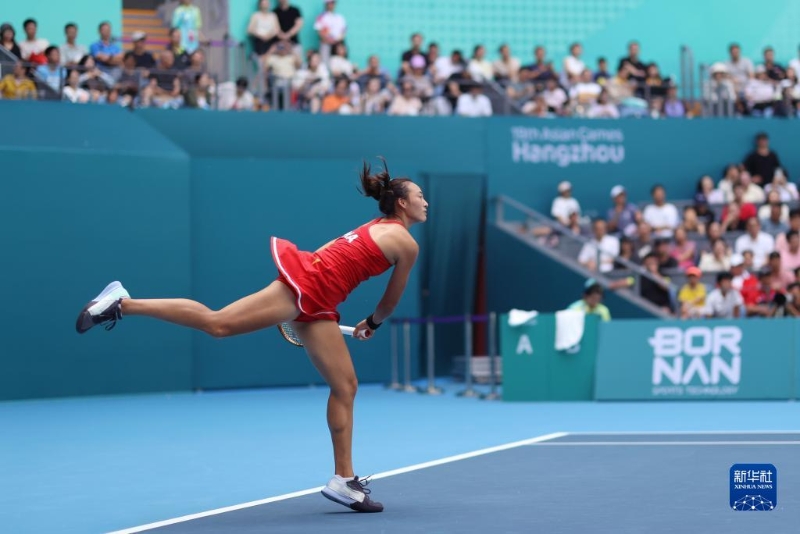 當(dāng)日,在浙江杭州奧體中心網(wǎng)球中心進行的杭州亞運會網(wǎng)球女子單打決賽中,中國選手鄭欽文以2比0戰(zhàn)勝隊友朱琳,奪得冠軍。