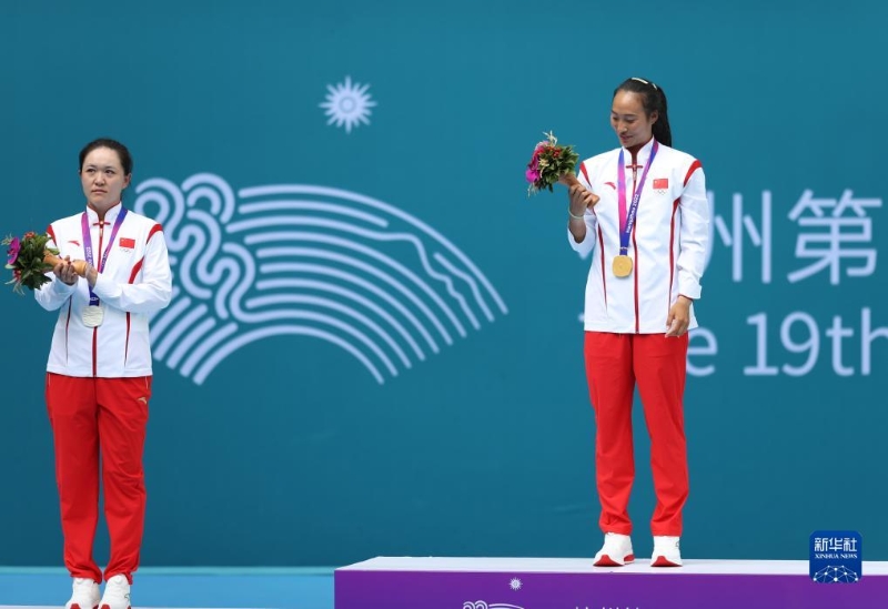 9月29日,冠軍中國選手鄭欽文(右)與亞軍朱琳在頒獎儀式上。