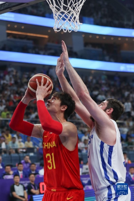 9月28日,中國(guó)隊(duì)球員王哲林(左)在比賽中上籃。