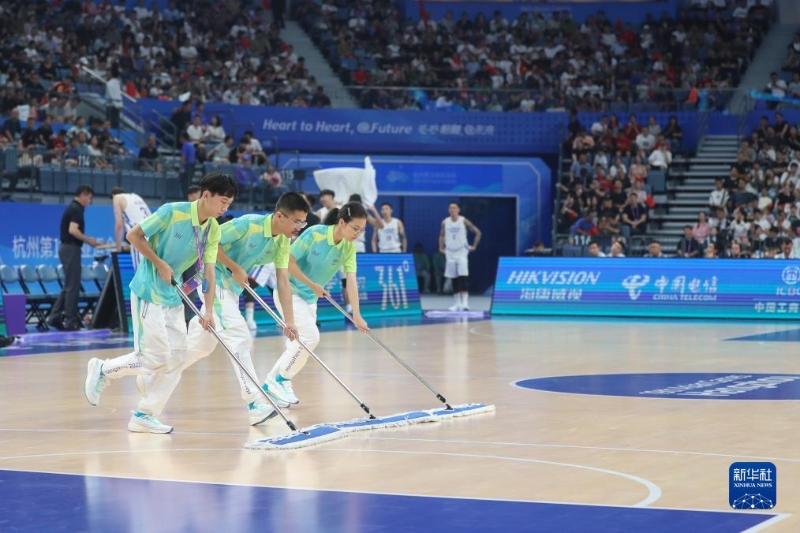 9月28日,志愿者在比賽前清潔場(chǎng)地。