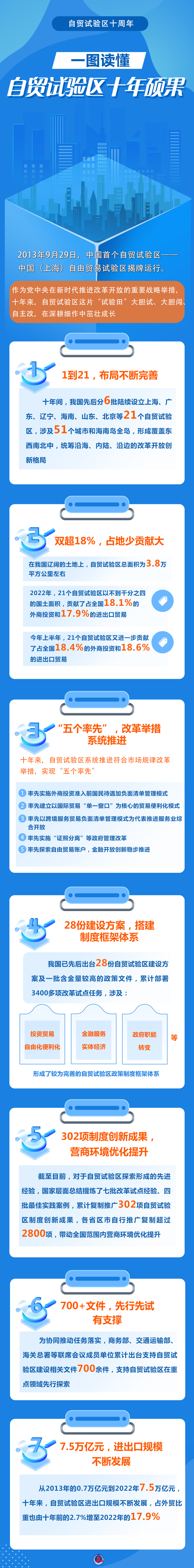十年間,我國先后分6批陸續(xù)設立上海、廣東、遼寧、海南、山東、北京等21個自貿(mào)試驗區(qū),涉及51個城市和海南島全島,形成覆蓋東西南北中,統(tǒng)籌沿海、內(nèi)陸、沿邊的改革開放創(chuàng)新格局。