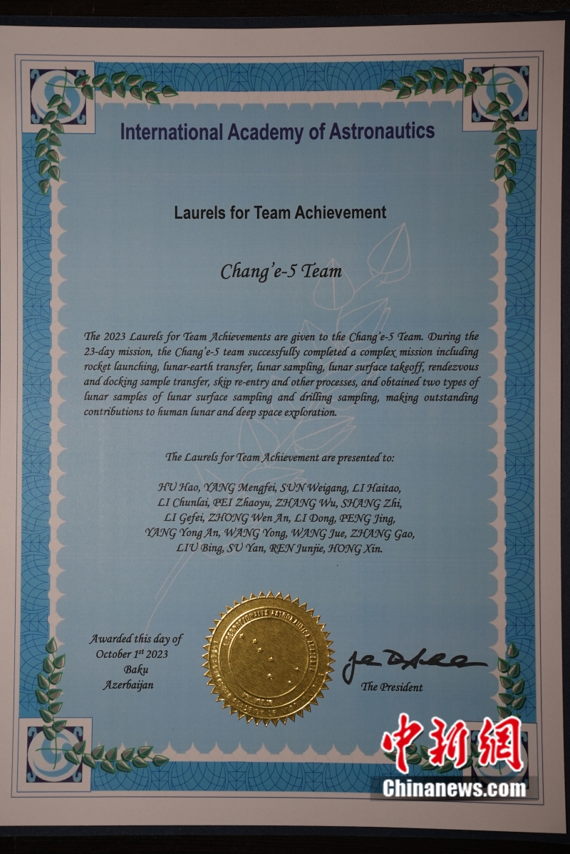 中新網北京10月2日電(馬帥莎)記者2日從國家航天局獲悉,10月1日,在阿塞拜疆巴庫舉辦的第74屆國際宇航大會(IAC)期間,國際宇航科學院主席舒馬赫等科學家為中國嫦娥五號團隊頒發(fā)了“勞倫斯團隊獎”。嫦娥五號任務總設計師胡浩等作為團隊代表出席頒獎儀式,并宣布嫦娥五號月球科研樣品即將面向國際開放申請,歡迎各國科學家共同研究,共享成果。