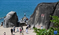 10月1日,游客在三亞市天涯海角游覽區(qū)游玩。