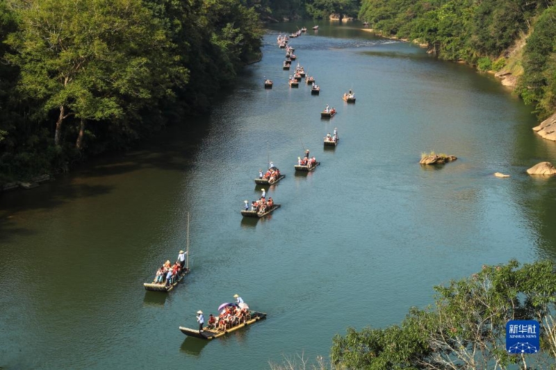 10月1日,游人乘坐竹筏欣賞武夷山國(guó)家公園九曲溪兩岸風(fēng)景。