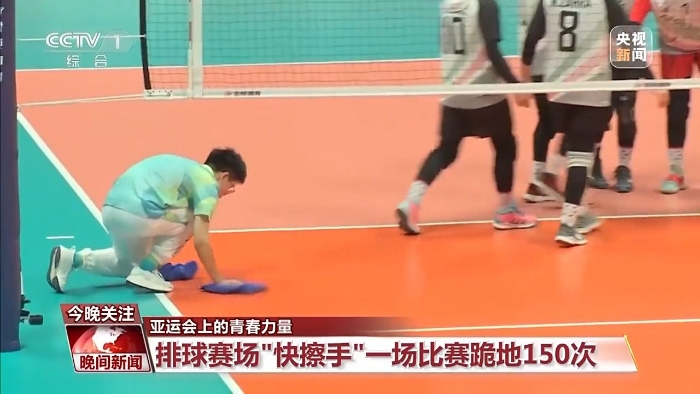 起身疾跑、單膝下蹲、雙手擦拭,整套動作一氣呵成,略帶汗?jié)n的地面馬上恢復(fù)光澤。觀看亞運(yùn)會排球比賽的觀眾對他們可能并不陌生,他們就是在排球比賽過程中負(fù)責(zé)擦試場地地面的專業(yè)志愿者,大家又親切地稱他們?yōu)椤翱觳潦帧薄?/p>