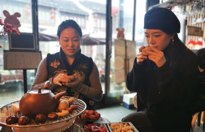 今年春節(jié)前后,圍爐煮茶風(fēng)靡大陸,陳曉文(右)經(jīng)常邀上兩岸的親朋好友,裊裊茶香中加深情誼。 中新社記者 鐘升 攝