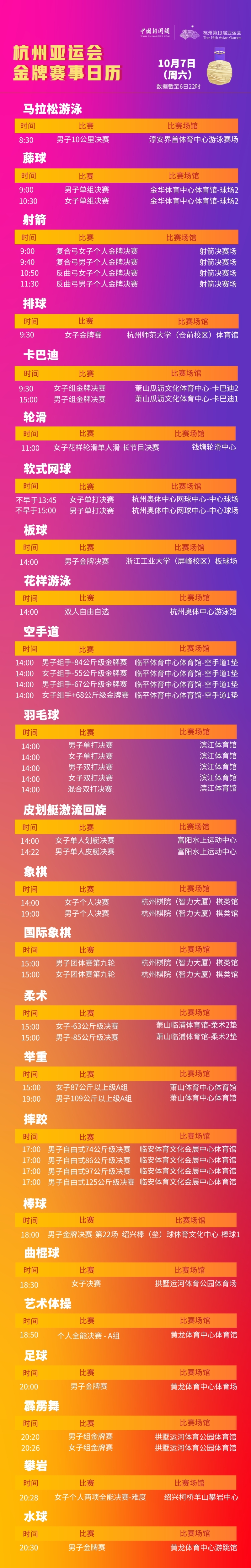中新網(wǎng)10月7日電 7日是杭州亞運會倒數(shù)第2個比賽日,將產(chǎn)生46枚金牌,數(shù)量之多在所有比賽日中排名第2。