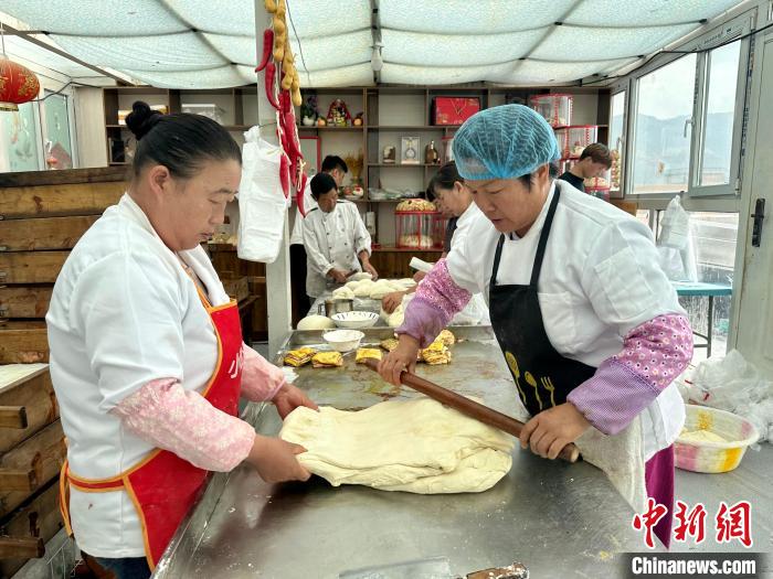 圖為宋維梅與幫工正在搟面。劉洋攝