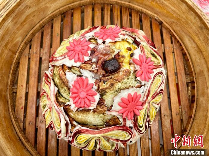 “月餅表面貼的面花需要用不同顏色搭配,面坯整形后擺放進蒸籠,再將簡單面花組合為復(fù)雜面花后,依次用清水將各種面花粘在面餅上,最后開始蒸制?!彼尉S梅邊忙活邊說。
