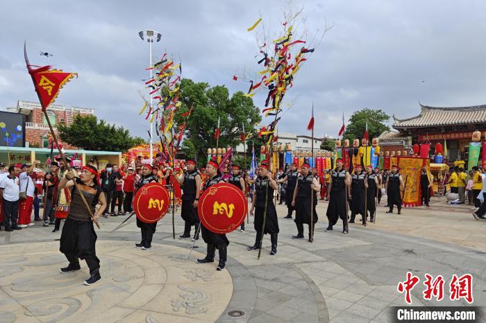 28日,“戚家軍鴛鴦陣”的武術(shù)表演吸引到許多信眾、旅客圍觀。吳冠標(biāo) 攝