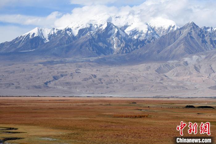 圖為10月2日拍攝的新疆喀什地區(qū)塔什庫爾干縣塔合曼濕地和慕士塔格雪峰。中新網(wǎng)記者 孫亭文 攝