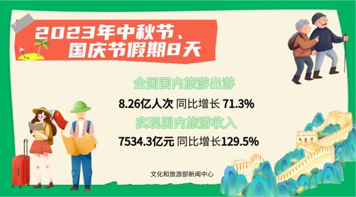 中新網(wǎng)10月6日電 據(jù)文旅之聲微信公眾號消息,2023年中秋節(jié)、國慶節(jié)假期,文化和旅游行業(yè)恢復(fù)勢頭強勁,全國假日市場平穩(wěn)有序。經(jīng)文化和旅游部數(shù)據(jù)中心測算,中秋節(jié)、國慶節(jié)假期8天,國內(nèi)旅游出游人數(shù)8.26億人次,按可比口徑同比增長71.3%,按可比口徑較2019年增長4.1%;實現(xiàn)國內(nèi)旅游收入7534.3億元,按可比口徑同比增長129.5%,按可比口徑較2019年增長1.5%。