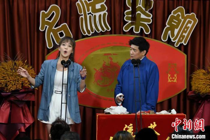 9月30日,姬天語與師傅劉增鍇在天津名流茶館為觀眾帶來精彩的相聲表演。中新社記者 佟郁 攝