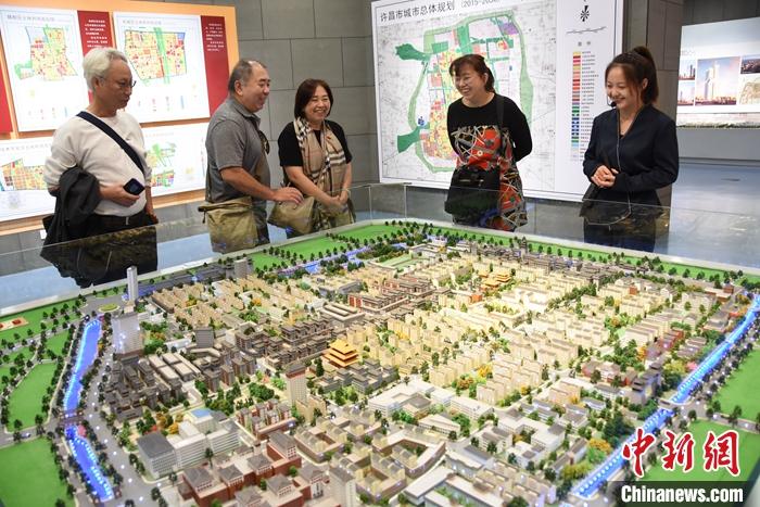 9月27日,河南省許昌市規(guī)劃展覽館,臺灣鄢陵同鄉(xiāng)會參訪團成員觀看城市建筑沙盤模型。 中新社發(fā) 王宇 攝