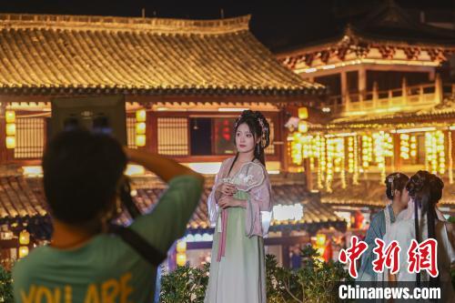 9月30日,江西贛州,游客身著漢服在江南宋城歷史文化街區(qū)內拍照。當日,眾多游客夜游江南宋城歷史文化街區(qū),享受假期生活。中新社記者 劉力鑫 攝