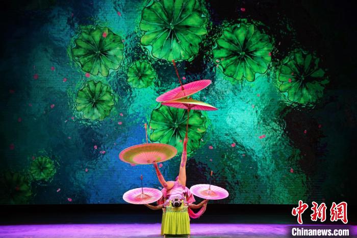 中國雜技團新晉優(yōu)秀青年演員扛鼎經(jīng)典作品中秋專場演出《青春ing》現(xiàn)場,圖為經(jīng)典節(jié)目《荷韻——單人蹬傘》。中國雜技團供圖