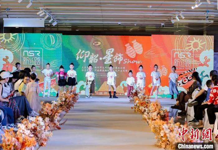 在這個(gè)特別的秀場(chǎng)里,小朋友們變身模特,他們穿著印有大河村遺址出土的典型器物、彩陶紋飾、星象圖案的文創(chuàng)T恤衫一一登場(chǎng)。